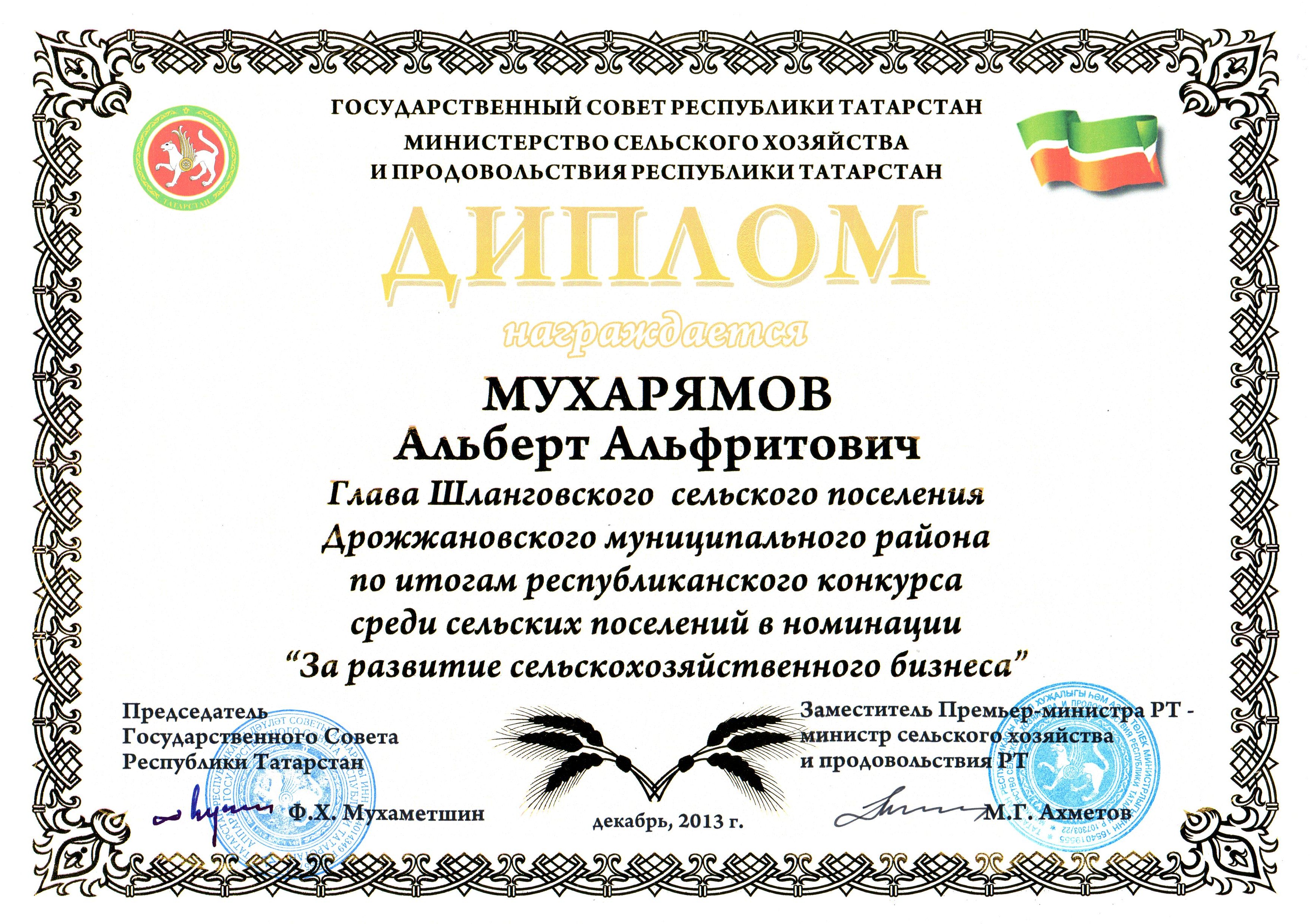 Дипломом награжден Глава Шланговского сельского поселения Мухарямов Альберт А.