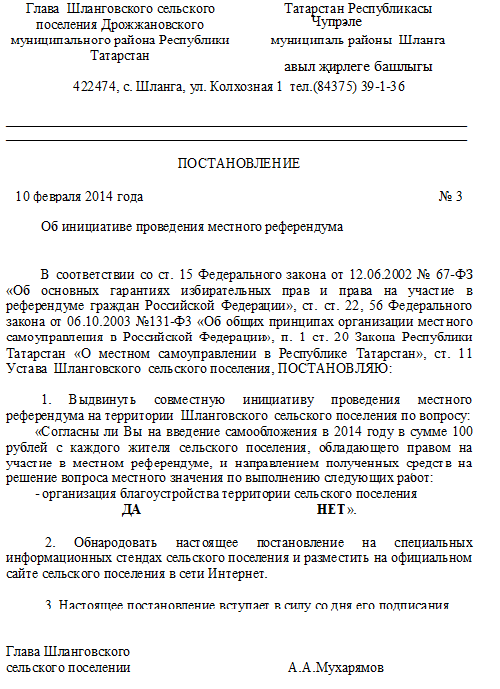 Постановление " Об инициативе проведения местного референдума"