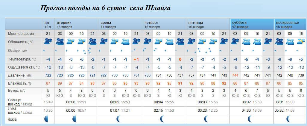 Прогноз погоды на 6 суток села Шланга............