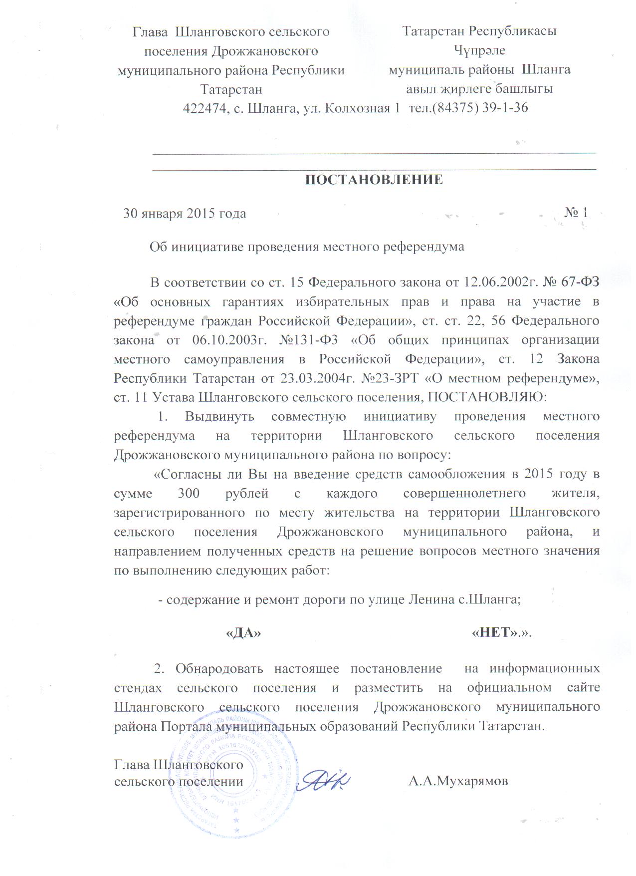 Устав Шланговского сельского поселения Дрожжановского муниципального района Республики Татарстан