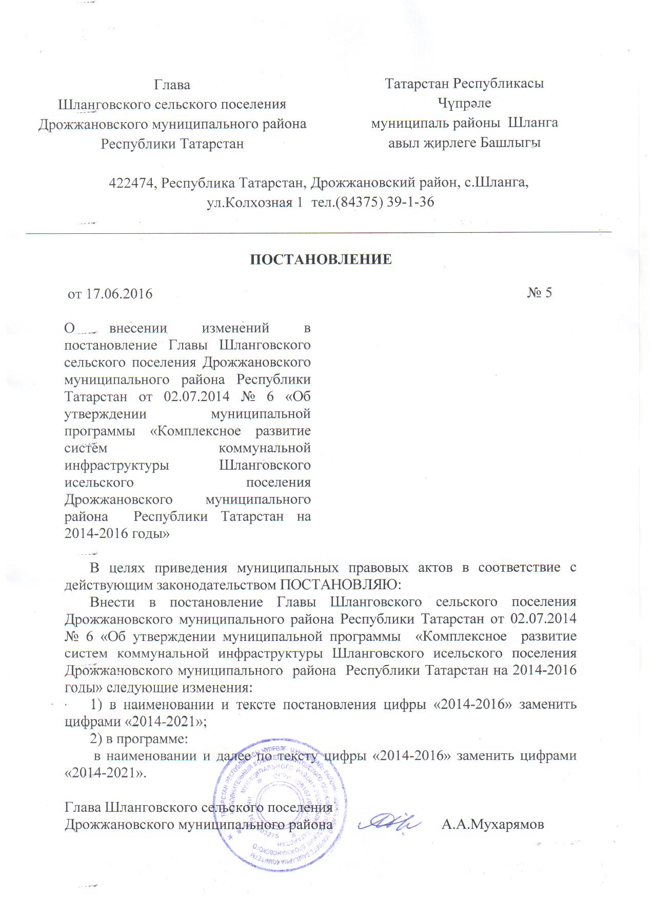 О внесении изменений в постановление Главы Шланговского сельского поселения Дрожжановского муниципального района Республики Татарстан от 02.07.2014 № 6 «Об утверждении муниципальной программы «Комплексное развитие систем коммунальной инфраструктуры Шланговского исельского поселения Дрожжановского муниципального района Республики Татарстан на 2014-2016 годы»