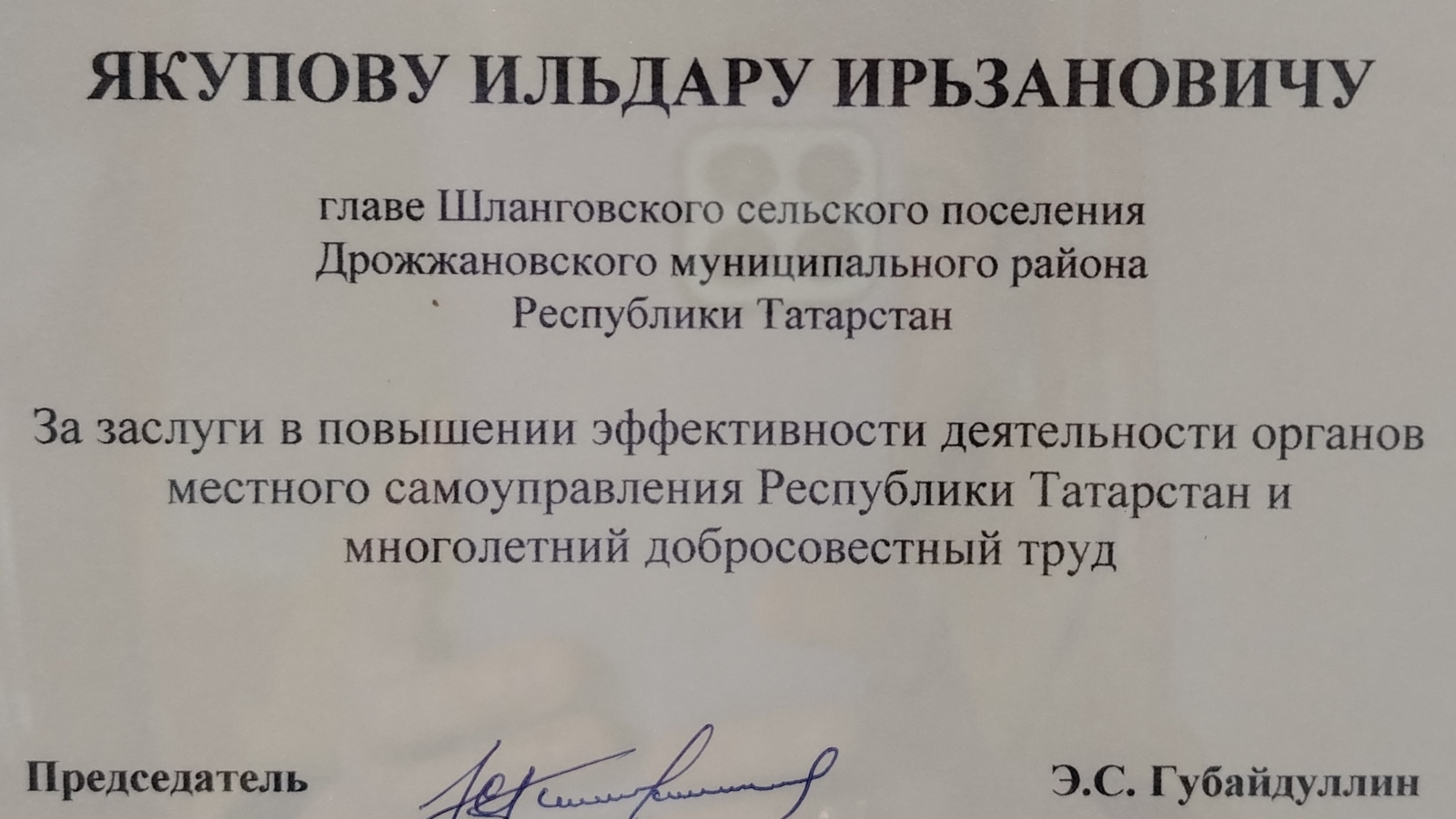 Татарстан Республикасы җирле үзидарә органнары эшчәнлегенең нәтиҗәлелеген арттырудагы казанышлары һәм күпьеллык намуслы хезмәте өчен Шланга авыл җирлеге башлыгы Якупов Илдар Ирьзанович , "Татарстан Республикасы муниципаль берәмлекләре Советы" Ассициациясе рәисе Эгзам Саматович Гобәйдуллинның Рәхмәт хаты белән бүләкләнде.